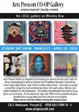 Arts Prescott Gallery is delighted to be hosting our second annual Local Youth Art Show, showcasing the work of students from Bradshaw Mountain High School, Chino Valley High School, and Trinity High School.  The show is a juried competition, judged by local professional artists, with cash prizes, ribbons, and written feedback for the participants.  The Gallery has dedicated this event to be a gift to our community.  All the work is for sale, and 100% of the proceeds will go to benefiting the young artists and their schools’ art programs. Make sure to visit the Gallery during this unique event.