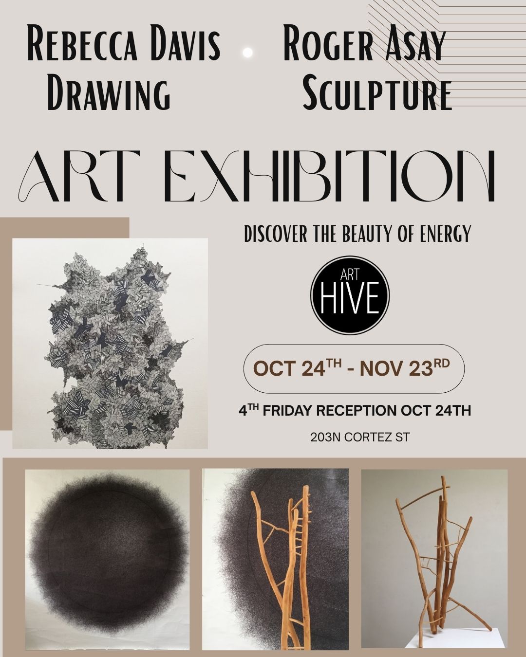 MATERIAL EXPRESSIONS Roger Asay Sculpture Rebecca Davis Drawing This exhibition presents contemporary abstract sculpture and drawings with an emphasis on the material used. Both artists create works with linear movement and fluid relationships between energy, form and material.